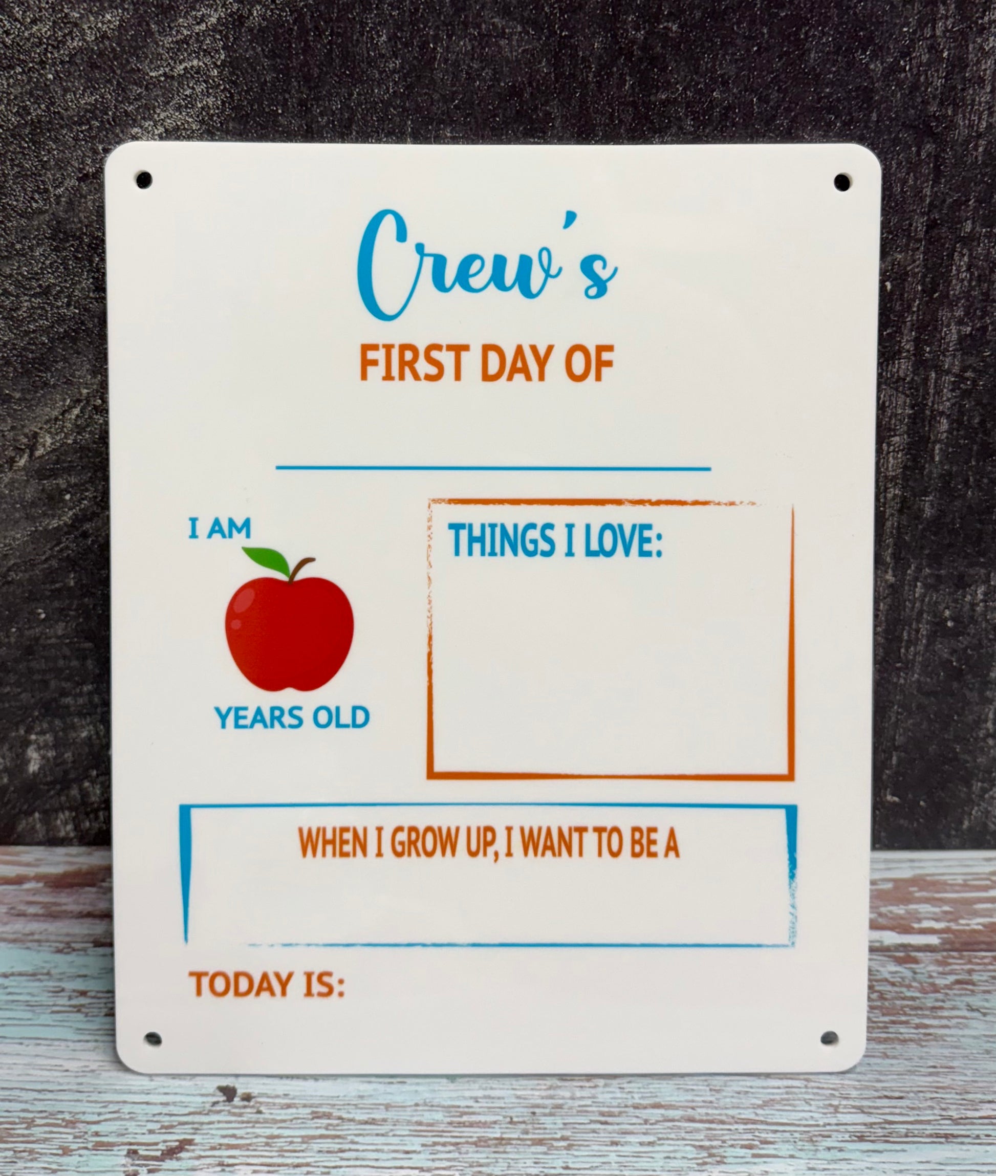 Capture your child's excitement as they head back to school with this personalized First Day of School Sign. Designed for lasting memories, this sign features a full-color UV print that you can customize with your child's name and favorite colors. Perfect for back-to-school photos, it includes fun sections to fill out like their age, things they love, and what they want to be when they grow up.