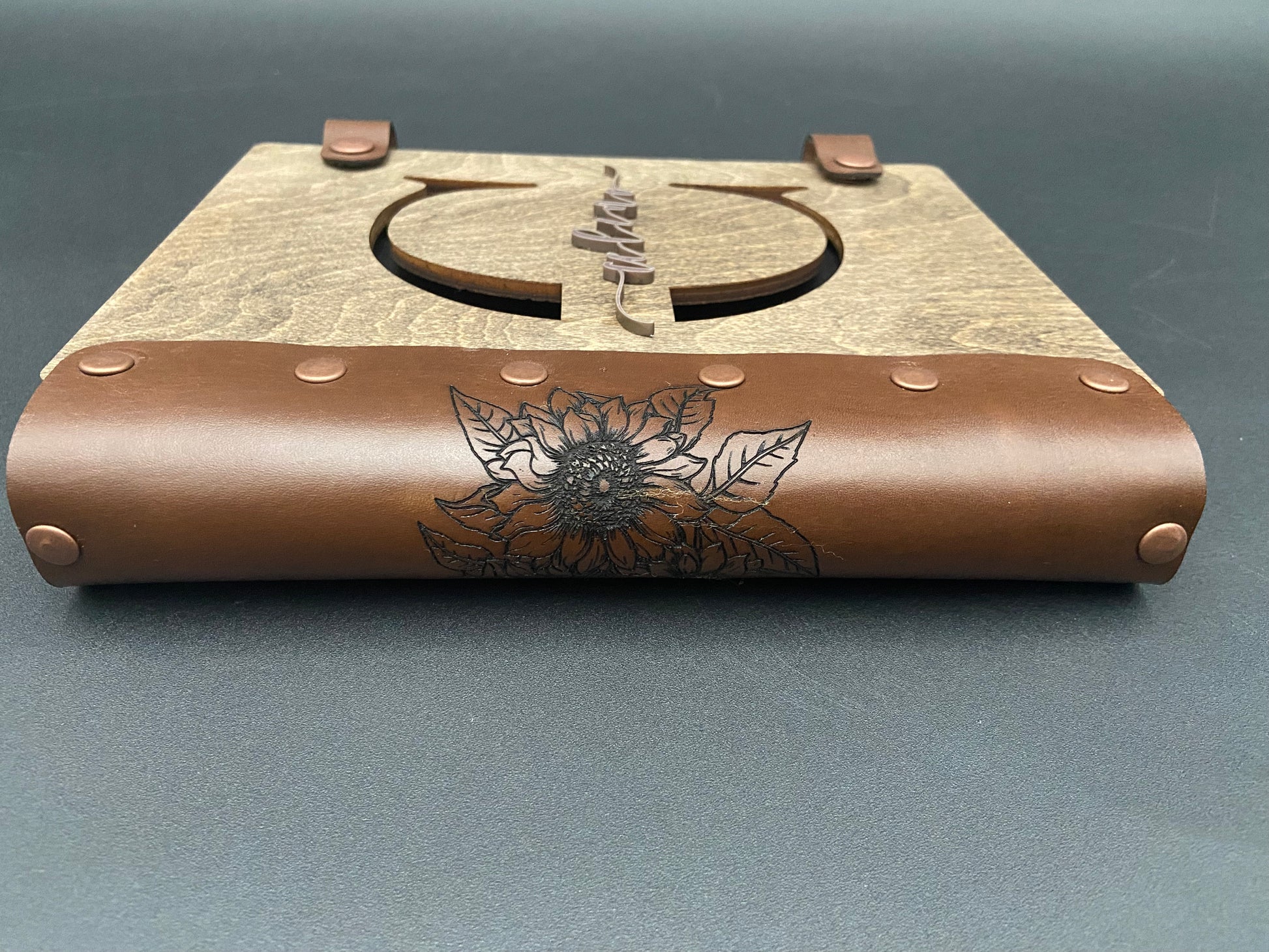 Featuring a solid wood cover with your personalized engraving and genuine leather binding accented by metal rivets, this piece is as durable as it is beautiful. Inside, you’ll find high-quality card stock pages — perfect for journaling, sketching, or keeping meaningful notes.