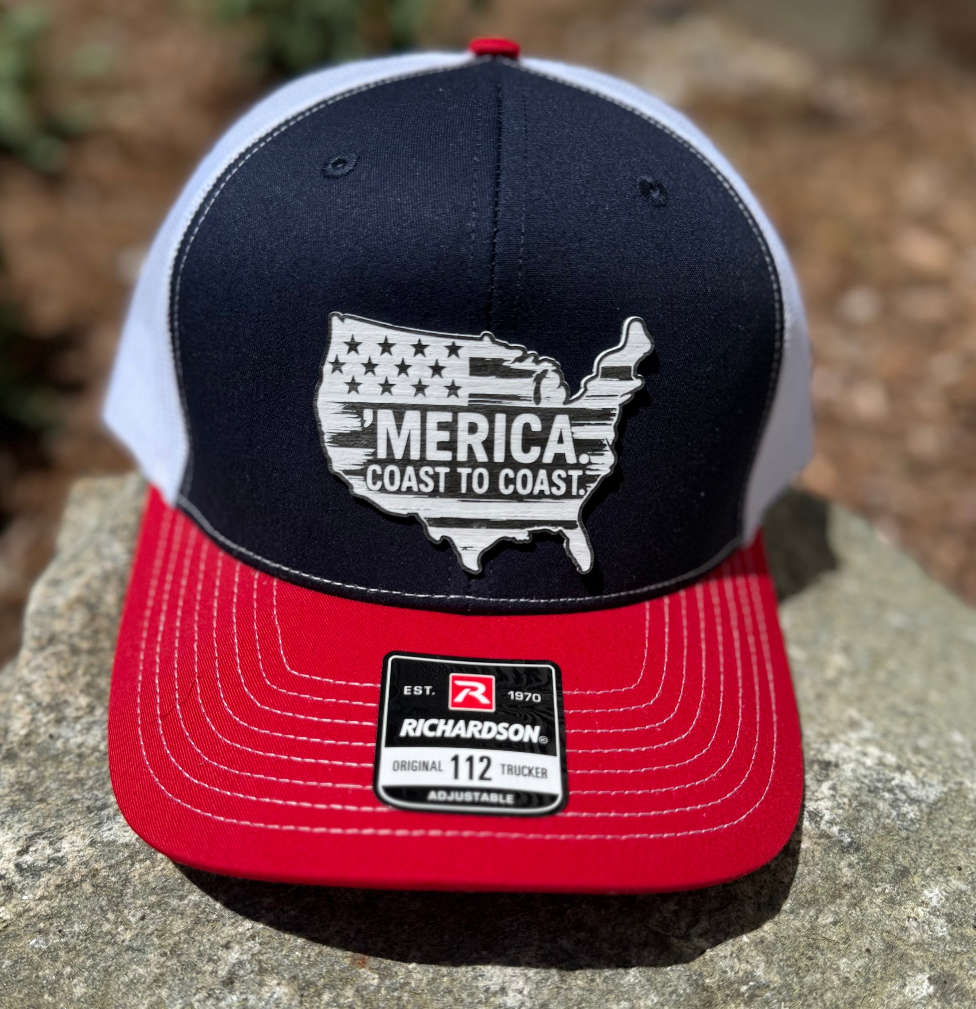 From backyard BBQs to East Coast docks and West Coast trails, this hat was made for the proud and free. Our ‘Merica Coast to Coast design features the United States silhouette cut and engraved onto a barnwood grey acrylic patch - stars, stripes, and all - pressed onto a bold Richardson 112 red, white, and blue trucker hat.