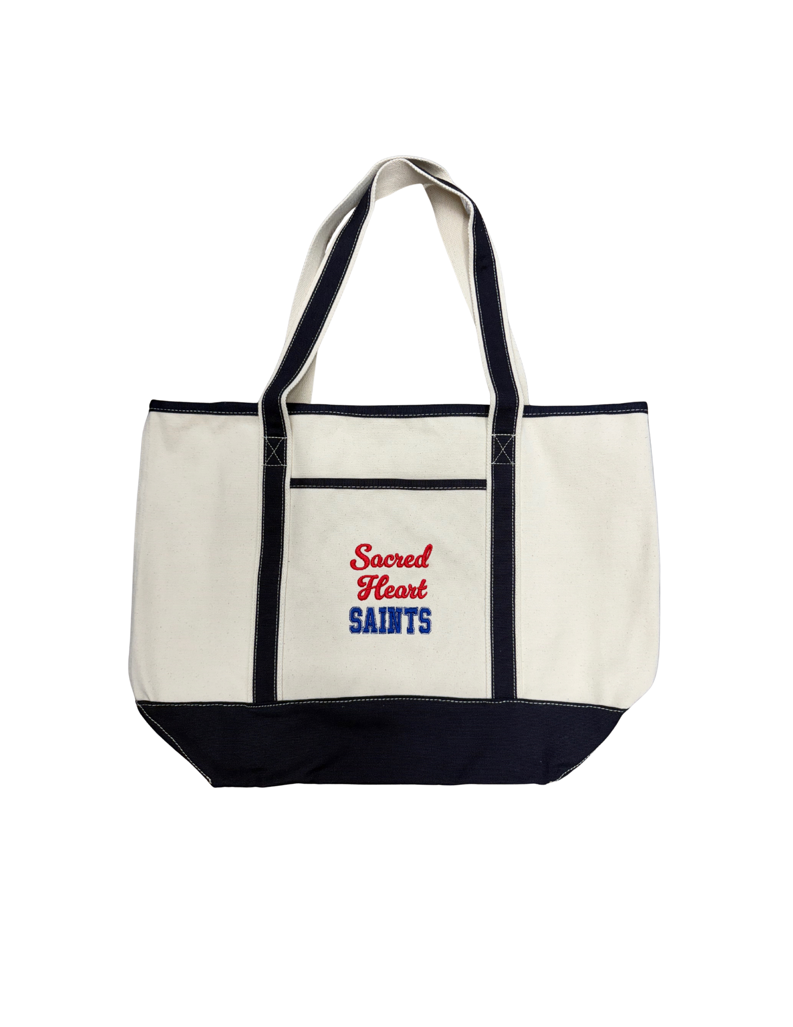 Crafted from heavyweight cotton canvas, this tote combines classic style with lasting strength. The spacious main compartment offers plenty of room for books, beach gear, or weekend essentials, while the contrast navy handles and bottom add a refined, nautical touch. The embroidered Sacred Heart Saints design on the front pocket gives it a polished, personal finish that proudly showcases your school pride.